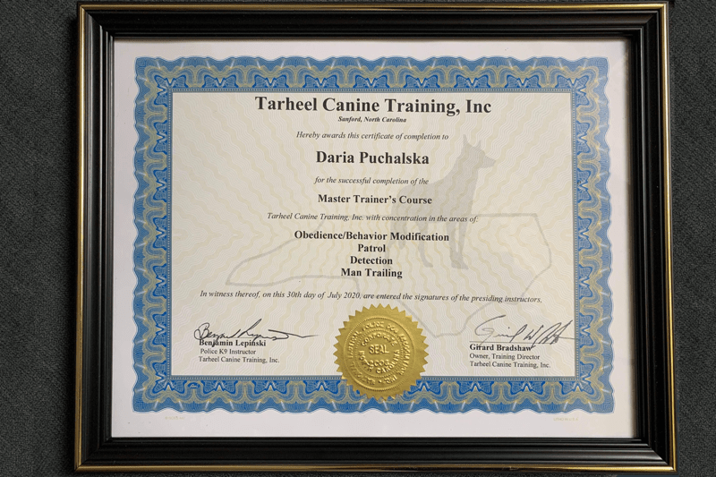 In the mid-2020s I got trained and certified in the Tarheel Canine Training Center, completing the Master Trainer's Course.